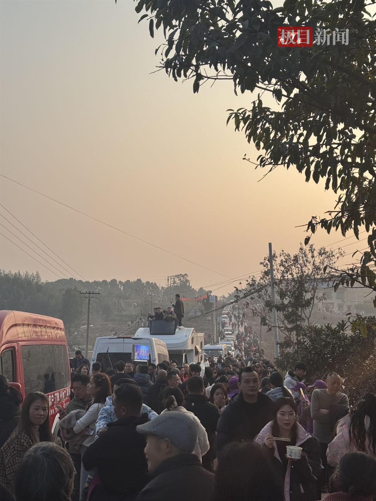 1月12日16时许,极目新闻记者在现场看到,车流已经延伸到了五六公里外。在国道与乡道的交叉口,有多名交警在执勤,他们建议车辆停在国道上,步行进入村里,不少网友选择步行或乘坐摩托车进村。三家通信运营商将应急通信车开到了现场,即便如此,因人流太多,网络信号依旧不稳定。